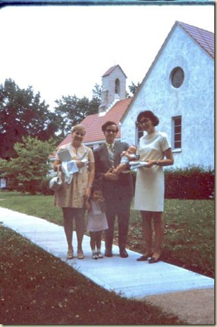 Steven’s Baptism was another very important event on our busy schedule in July, 1971. It was only a bit more than one year before that time, that we had joined Faith Lutheran Church on Tates Creek Road in Lexington. Besides singing in the choir there, I also joined the Lexington Singers, which was a community chorale group of about one hundred singers. I mention the singing here, because that was the only thing, other than my teaching job at the University, that I remember! The Ludwicks came for the ceremony as Steven’s Godparents. Adriane and Larry were teaching then at Tuskegee Institute in Alabama. Steven was not very cooperative that morning. It was clear that we had disturbed his sleep, which was very upsetting for him. We had to take him out in the middle of the ceremony. He was fine later, as long as he could snooze in someone’s arms while we were outside to take some pictures: